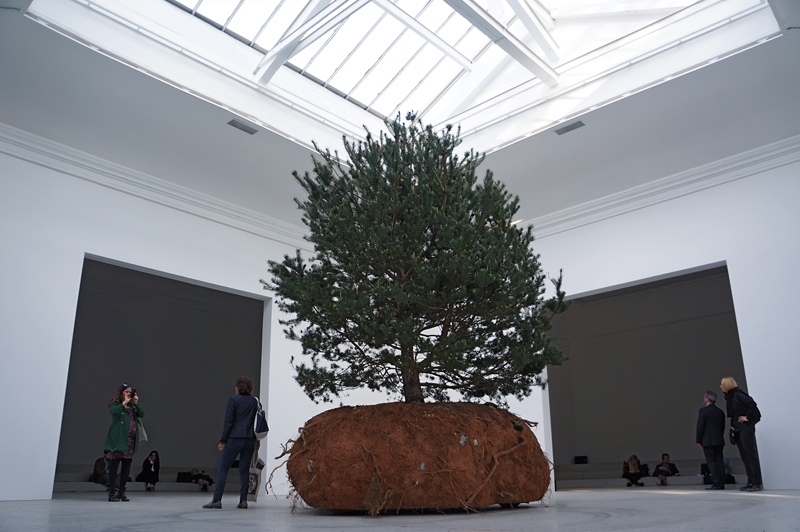 今年以「革命」(revolutions)為主題的法國館,由作曲背景出身、之後轉向造型創作的藝術家布斯爾-慕吉諾(Celeste Boursier-Mougenot)為代表。此次作品由室內外兩個部分組成,在展館外,觀眾便可看見兩棵樹木被固定於可移動的機械平台(隱藏於土壤中)與一片土壤之上,進入室內展廳後,可看到另一棵在展場中悠緩移動的樹,若仔細觀察,則可發現土壤上還有其他植被,這三組動力裝置宛如一座座可以自主移動的小型生態系統,樹的移行也使得展場成為一個超現實的有機空間。除了樹木所在、透著天光的展廳之外,館內還有三間圍繞著中央的展間,地面上鋪著可供觀眾或坐或臥的舒適海綿墊,屋內的音箱則播放著由樹上電流信號轉化而來的音頻噪音。