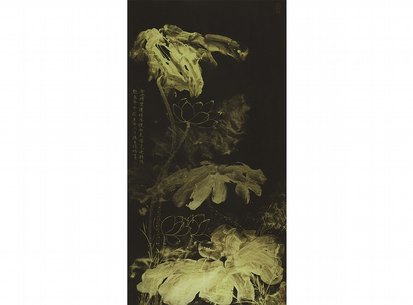 侯吉諒2010年作〈金池碧蓮〉,繪於王國財製磁青紙。