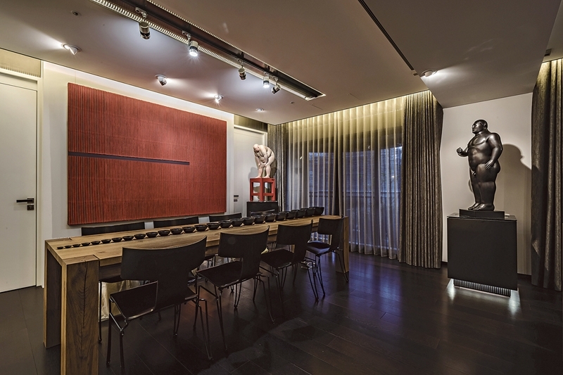 譚精忠家中餐廳的藝術品,左︰朴栖甫《描法》中︰牟柏岩《胖子系列No.4》右︰博特羅《亞當.夏娃》。桌上則放置朴康用《巴魯25套碗》。圖|設藝之間