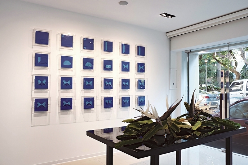 譚精忠辦公室的藝術品。左︰Robin Rhode《甜蜜物件》中︰董心如《熵龍》前︰內田望《To the sky》右︰內田望《一條想當龍的蛇》。圖|設藝之間