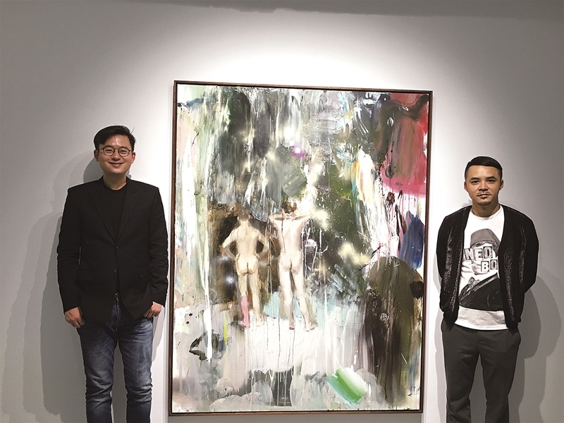 谷公館負責人谷宇(左)與藝術家韋嘉合影。中間作品:《沉醉》.丙烯、畫布.180×140 cm.2016。(攝影/林亞偉)
