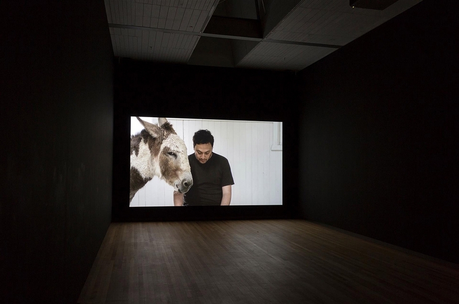 《兩組往遠方展開的鏡頭》,錄像,2013-14 藝術家 Shannon Te Ao 對一群毛茸茸的動物們緩緩地朗讀詩句,驢子、天鵝、兔子等觀眾聽他念誦從紐西蘭前殖民時代毛利傳統歌謠裡重新編寫的文字,其中描述著尋根以及重新建立關係的欲望。平實的聲音逐漸滑過各種時間的、記憶的、人與自然間的各種界線。