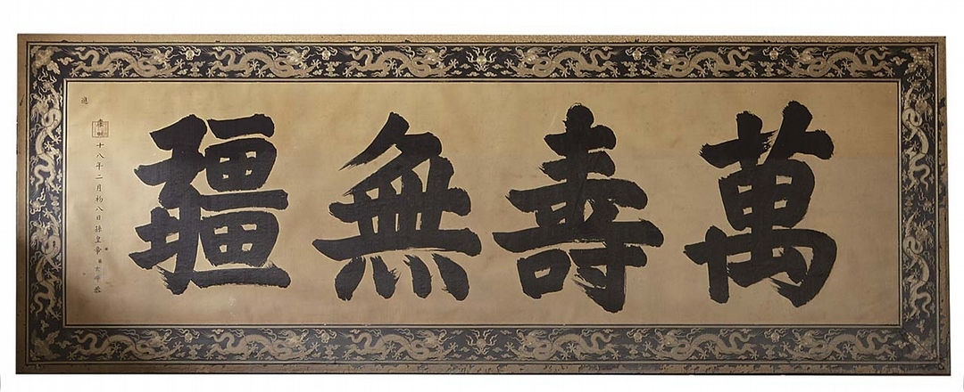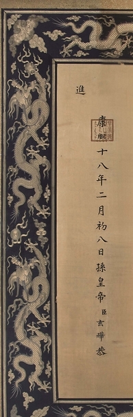 清〈康熙帝御筆繡字萬壽無疆匾〉是北京故宮博物院院藏中國國家二級文物,為故宮慈寧宮後殿原狀陳設文物。大匾以黃色緞面作為襯底,上用黑色繡線繡製楷體「萬壽無疆」四字。根據大匾左側繡字「康熙十八年二月初八日孫皇帝玄燁恭進」以及康熙皇帝的印章、落款題字等線索(圖2),查閱史料得知,康熙十八年二月初八日,是太皇太后(孝莊皇太后)誕辰,據《康熙起居注》記載:「初十日乙亥,早,上率諸王、貝子、公等,內大臣、大學士、都統、精奇尼哈番、侍衛等詣慈寧宮,慶賀太皇太后聖誕,親撰表文並詩二首,躬自繕錄。又書『萬壽無疆』四大字匾額。巳時,上詣太皇太后宮,視懸匾額。」由此可知康熙皇帝專為太皇太后壽辰而親筆書寫「萬壽無疆」四字,並被懸掛於慈寧宮後殿,為太皇太后祈壽。在《欽定日下舊聞考》中查到的記載:繡字「萬壽無疆」匾懸掛在大佛堂中,所以,這繡字「萬壽無疆」匾有可能是依照康熙御筆「萬壽無疆」而特別定製的。