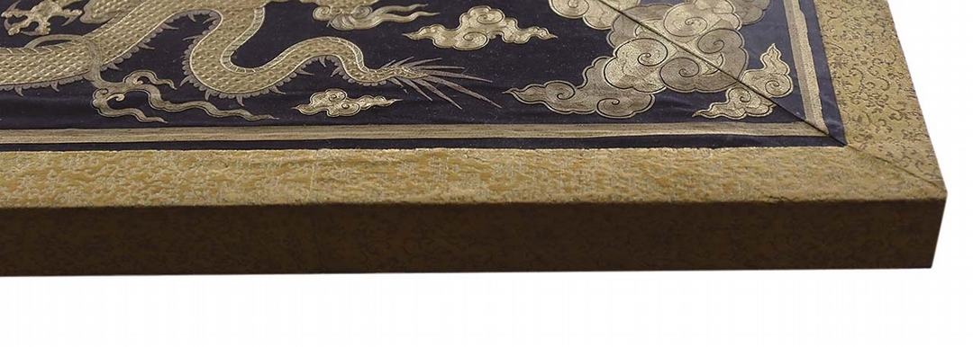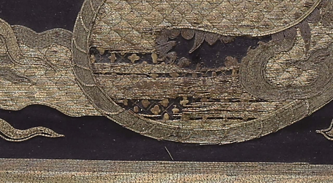 此匾縱144公分、橫387公分、厚4.5公分,以黃色緞紋組織面料作為襯底材料,以黑色緞紋組織面料作為四周的鑲裱材料。在黃色緞面上用黑色絲絨線繡製「萬壽無疆」四字,刺繡方法為平繡法,利用長短針繡製,線跡緊密不露底襯(圖3),繡線有雙層或三層的疊加使繡字微微凸起。在黃色緞面的四周鑲裱黑色大緞,鑲裱前在黑色大緞上用捻金線繡製雲紋及16條行龍,龍首、龍脊、龍爪、龍尾、龍珠、雲紋等都使用了平金繡法、龍鱗使用了蹙金繡法,在排列好的捻金線下用生絲線繡製凸起的十字(圖4),然後再用絲線以釘金繡法固定上方的捻金線,使龍鱗突出更富有立體感(圖5)。龍身部分的刺繡步驟較為複雜,繡者先在襯底面料上用勾線法畫出網格,再用成簇的黃色生絲線在網格中繡製突出的十字,用捻金線(釘金繡法)依次排列,覆蓋網格和十字,最後在滿鋪的捻金線上再用生絲線排成網格加以固定(圖6)。在平金繡繡製時,將捻金線每3公厘固定一針,使捻金線以盤旋的方式繡製圖案。文物整體刺繡針法精細纖巧,製作精湛,質料考究,且這種繡龍工藝僅在明代服飾上或清早期的龍袍上有所見,可以說是宮廷釘金繡中的精品。大匾最外周包裹外框的材料為織金緞(圖7),用桑蠶絲線和捻金線為原料織造,紋樣為四方連續的纏枝花卉紋,每9公分一個循環往復。組織結構以緞為地,為六枚二飛不規則緞紋;以金顯花,花組織為三枚斜紋。通過補配材料的復原織造,總結了包邊使用的材料,織金緞的製作工藝,以便歸納此類紡織品材料的製作工藝流程,為材料研究和保護修復提供依據。