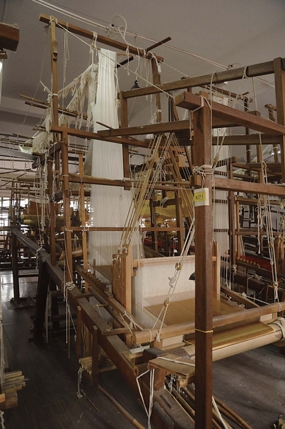 1、解決和文物面料一致的補配材料織造問題:首先,復原補配材料所需原材料的規格和技術指標必須符合原文物的要求,選用符合文物規格(規格包含:細度、捻度、捻向)的優質蠶絲,作為織造時的經線和緯線,因為文物歷經百年後顏色褪變基本處於穩定狀態,植物染料的牢固度相對較差,如果用於補配材料染色很不穩定,時間久遠後會出現與文物顏色差距較大的可能性,所以考慮使用合成染料依照文物顏色先對經緯線染色,然後裝造及恢復古代傳統大花樓織機(圖8),經過上經、數絲、引纖、拾綾、穿筘(圖9)等準備工作後開始織造,織造時利用線綜起落的操作方法,採用一梭通梭織地,再織花。通過拽花工提花,織造工通過投梭方式進行織地織花,達到效果。期間控制好緯密度,及時控制經向張力,從而織出平挺細密的面料。最後,將織造好的補配材料再進行植物染料浸泡作舊。
