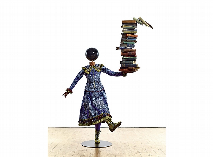 因卡.修尼巴爾《平衡知識的女孩》.玻璃鋼模特、荷蘭蠟非洲印花棉紡織品、書本、地球體、鋼底板.179×139×89 cm.2015。Image courtesy the artist, Stephen Friedman Gallery, London and Pearl Lam Galleries, Hong Kong, Shanghai and SingaporePhotographer: Stephen White
