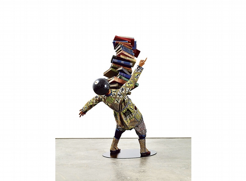 因卡.修尼巴爾《平衡知識的男孩》.玻璃鋼模特、荷蘭蠟非洲印花棉紡織品、書本、地球體、皮、鋼底板.156×94×120 cm.2015。Image courtesy the artist, Stephen Friedman Gallery, London and Pearl Lam Galleries, Hong Kong, Shanghai and SingaporePhotographer: Stephen White