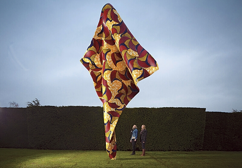 Emily表示,Yinka並不在工作室裡頭創作,工作室反倒像是一個設計中心。像是Yinka這類已經建立強烈個人特色的藝術家,常常會停滯不前,因此,除了發展嶄新的網版版畫作品外,他也創作了「風雕塑」(Wind Sculpture),將他慣用的荷製蠟染布,轉換成雕塑品,就像是一塊布料在風中飄逸。