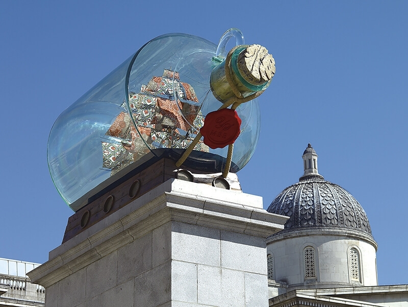 Nelson’s Ship in a BottleDate: 2010Dimensions: 290 x 525 x 235 cmMedium: Fibreglass, UV ink on printed cotton textile, steel, brass, resin, linen rigging, acrylic and woodPhotographer credit, image courtesy: Courtesy the artist and Stephen Friedman Gallery, London, Photographer: Stephen White