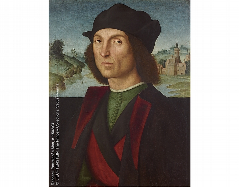 拉斐爾與達文西(Leonardo da Vinci)及米開朗基羅(Michelangelo)三人共同主宰著義大利文藝復興時期的繪畫。這幅《男子肖像》(Portrait of a Man)可能是拉斐爾早期的作品。畫作描繪一不知名的模特兒,頭部以明亮而寬闊的風景為背景。人物服飾的細節以清晰劃分的有力色塊呈現,為畫面前景創造出律動感。背景的風景畫有著纖細、羽毛狀的樹木,讓人想起彼耶特羅.佩魯吉諾(Pietro Perugino,約1445/48-1523)的作品;拉斐爾曾在佩魯吉諾位於佩魯賈(Perugia)的工作室工作,直到他1504年離開前往佛羅倫斯為止。此作有著拉斐爾典型的繪畫風格:用色節制,色彩清晰有力。他的用色與型態關係緊密,更加強調出構圖的結構。如此的和諧與平衡正是義大利文藝復興極盛時期的典型特色。