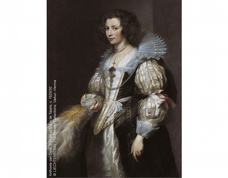 范戴克的藝術生涯由擔任魯本斯(Peter Paul Rubens)的首要助手開始,往後更成為倫敦宮廷的首席畫家。《瑪利亞.德.塔西斯肖像》這幅細緻作品正是范戴克的傑作之一。塔西斯家族最初來自貝加莫(Bergamo),在十五世紀晚期開發出歐洲最早的郵政系統。這幅作品描繪的是年約19歲的瑪利亞.德.塔西斯(Maria de Tassis, 1611-1638)。她所屬的塔西斯家族支脈在安特衛普發展,家族成員傳統上擔任帝國郵政局長之職。畫中她穿著華麗的絲質禮服,特意的低胸與臀部設計亦符合法國當時的時尚。范戴克筆下的衣袍及鴕鳥羽毛扇相當著重於細節呈現及豐富的色調效果,讓人聯想起提香(Titian)的藝術風格。極度精緻的蕾絲寬領襯托出瑪利亞的青春面容。她凝視觀者,帶著若有似無的一抹微笑,呈現一種不做作的魅力,更讓她莊嚴的姿態富有生氣。