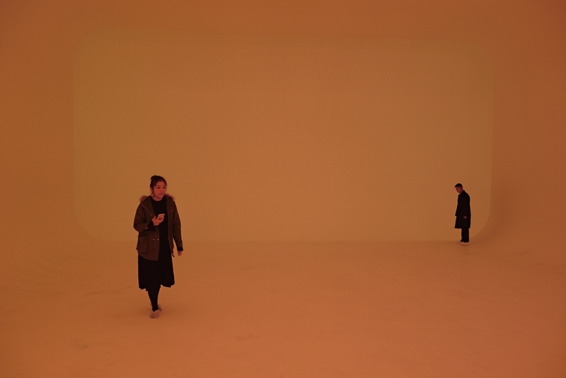 未能展示室外作品的龍美術館回顧展呈現了特瑞爾其他系列的作品,在這裡,光更加絢麗,深具迷惑性和煽動性,隱隱指涉著人類文明。3件沉浸式作品帶來的感觸最為難忘,《全域裝置》(Ganzfeld)是特瑞爾根據龍美術館的空間特別打造的空間裝置作品。特瑞爾在1976年開始了「Ganzfeld」系列的創作,Ganzfeld一詞源於德語,意為全域(entire field),Ganzfeld實驗是1930年代盛行的超感官知覺實驗,在實驗中被試者躺在睡椅上,被蒙住雙眼,戴著播放白色雜訊的耳機,在感官知覺如此蒙蔽的情況下,被試者接收另一人用意念傳送的圖像資訊,之後在圖集中挑選接收到的圖像。實驗得到的33%的正確率高於預測的25%,昭示著意識的神秘性。