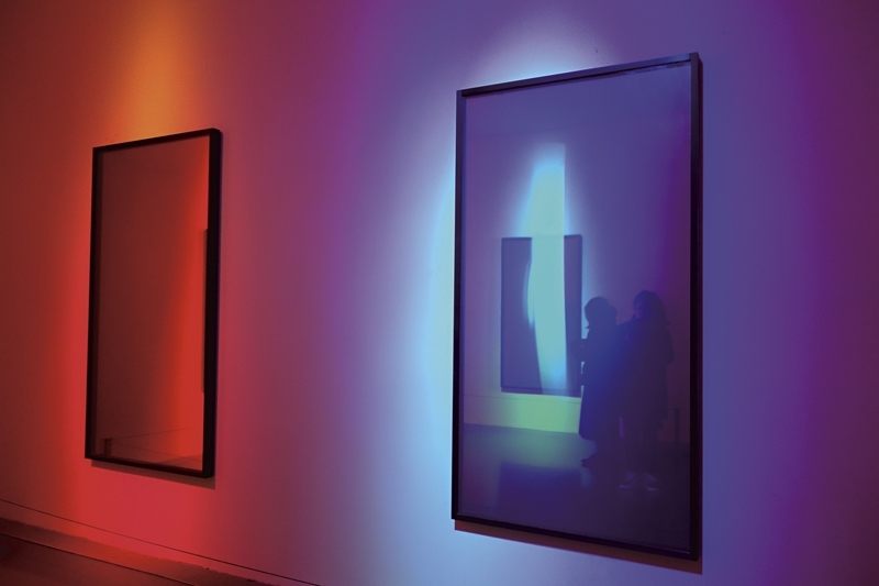 龍美術館展出的《全域裝置》是一件純白的房間,特瑞爾在正對面的牆壁上挖出了圓矩形的洞,將光源藏於其中,燈光顏色不斷變換,空間中除了光別無他物,恍若一場光的派對。從方形入口處溢出的熒螢光芒有著無窮的魅惑力,拾級而上踏進空間,周身有被煙霧環繞之感,彷彿光芒正在緩緩流淌。看不見光源和邊界為整個作品敷上一層不真實的前衛感,而圓矩形洞口處的光芒略亮於他處,使之看上去像是一個入口、艙門或啟示,未來感、科技感隨之襲來,整件作品的空曠和靈性讓人想到太空、雪地或夢境,彷彿連結著宇宙最隱秘的深處。在這樣純粹的視覺刺激下,其他感官好似暫時失靈,觀看成為唯一重要的事。