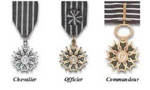 榮譽勳章(ordre honorifique )的級別,依劇文化部制定的法令,由低而高,區分為三個級別,依續為騎士(Chevalier)、軍官(Officer)及司令官(Commandeur)。