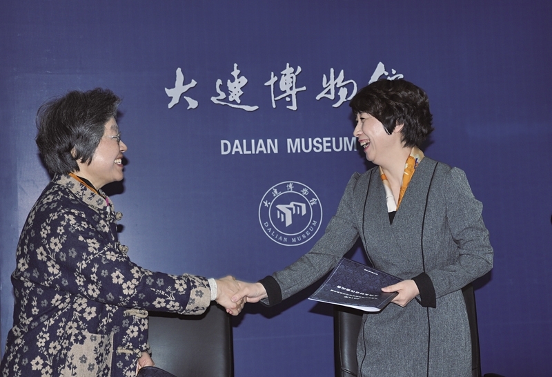 開幕現場。鴻禧美術館廖桂英(左)與大連現代博物館館長姜曄(右)。