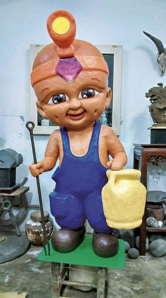 照海小童身上的配備,正是當地人夜間「照海」的捕魚基本配備。與珍珠小童為一組的系列創作,呈現出吉貝人的日常。(吳飛達提供)