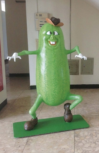 《瓜果樂團》這組作品,結合澎湖後寮村的重要名產,包含嘉寶瓜(澎湖西瓜)、楊梅果、梭子蟹、馬糞海膽以及石居章魚,組成一個開心的樂團。嘉寶瓜跳街舞,楊梅果則是主唱。(吳飛達提供)
