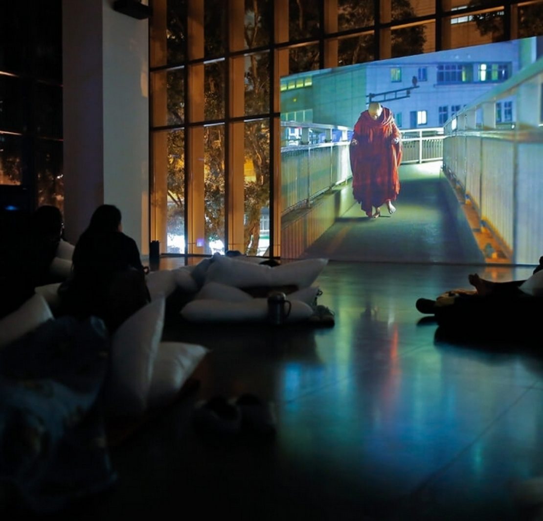事實上從「來美術館郊遊」起,蔡明亮便大量舉辦各種日常化、通俗化,甚至社區聯誼化的教育活動,充分掌握美術館教育推廣功能所能帶來的連結性與擴散性。(註3)他曾說:「延伸的活動很簡單,就是希望帶觀眾進來,是一種分享的概念,因為過去喜歡我的電影的朋友都不太能分享自己的感受,電影看完了無法感染擴散,但是有趣的活動是可以互相分享傳遞的。」(註4)我們不難發現,無論是他過去舉辦的深夜講堂、故事坊,還是此次「無無眠」展的「夜唱美術館」,這些活動其實才是作為策展人的蔡明亮,親力親為地「caring」他的(未來)觀眾的關鍵時刻,目的都是為了使其影像美學擁有更多與市民生活接軌的可能。正如自《你那邊幾點》(2001)起便養成的親自售票習慣,蔡明亮始終保持他那「一位一位兜售的真實交心」。因此,這些週末小型音樂會或漫談沙龍乍聽之下,固然可能會給人綜藝化或迷眾(cult)化的疑慮,但平心而論,它們恐怕就是著眼不同的族群;期盼原本不常涉足美術館的觀眾、聽眾,有機會在截然不同的空間情境下,與他的影像相遇。這些以人為中心的場合,自然無須繁複的物件或空間佈置,因為活動本身就已具備重新理解其影像美學的契機。