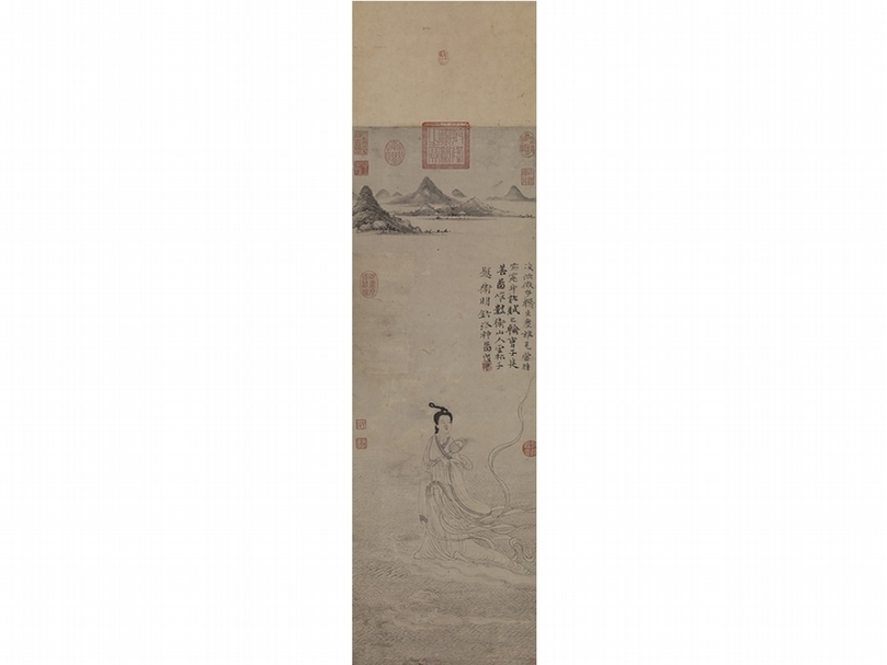 元衛九鼎〈洛神賦圖〉,90.8×31.8公分,國立故宮博物院藏。本次「國寶的形成」特展將展出,其為傳世孤本,另有同朝畫家倪瓚的題詩。畫家運用白描筆法表現出洛神的溫婉迷人,只見她細長的衣帶隨風飄揚,姿態端莊。圖∣國立故宮博物院