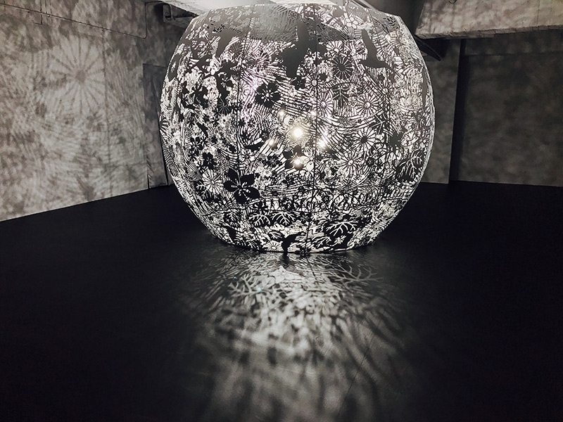 走進主展間,映入眼簾的是一座大型的光影裝置《重力與恩寵》,此為延續去年日本愛知三年展發表的大型光影裝置,以挑高7米呈現,移師至台北空間,雖然作品規模較小,但帶來的震撼卻不亞於日本。大卷伸嗣以台北空間為基地,再以黑色的紙張包覆整個空間,模擬浩瀚無際的宇宙,而雕刻的中間則是一顆會發光的太陽,透出的光源,照亮圓球體上的紋樣,產生光影的變化,為空間帶來視覺驚奇。這顆模擬的人造太陽是利用鏡面包覆的LED強光為中心,光源為地球帶來生命的能量,而金屬雷射切割紋樣則是地球瀕臨絕種的植物與生物,走進空間彷如被謎樣般的花紋意象所包覆,置身在幻象的空間裡。在另一展間呈現的是《無垠》系列的手工絹印版畫,以及鍍金的雕塑《存在之證-無垠—你看著我時,我正凝望著你》。此系列手工版畫,以人類文明進展的器物造型為主,藝術家以故宮代表文物的三種器型為本,在器物造型中的紋路則是擷取自日本樟樹的年輪所燒製而成的,除了年輪的大小不一的線條外,上頭還有來自古文明符碼堆疊其中,此作是人類文明沉澱與積累的象徵,版畫一組共三件,每件各三個版數,純手工印製,相當細膩精緻。安卓藝術負責人李政勇表示這次展覽花費金額高達百萬,是今年安卓藝術最具代表性的展覽之一。目前作品在開幕當天已有數件鍍金雕塑、手工絹印版畫與攝影之作已有藏家收藏,此展最大型的光影裝置其定價為數百萬,是此展中的最高價。