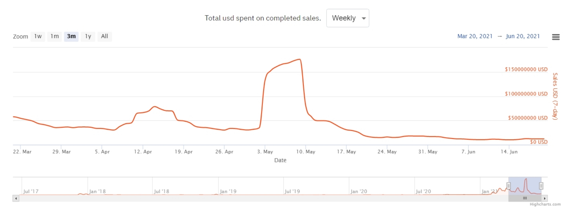 根據追踪NFT市場網站NonFungible的數據,NFT第一季的銷售總額達到20億美元。但數據也顯示,NFT市場明顯正在退燒,整體銷售額自5月9日的7日平均交易額峰值1.76億美元暴跌至6月13日那周的剩下僅約1,045萬美元,之後至今也差不多只維持在這個數字,意味這個市場的整體交易額倒退至今年初的水平。
