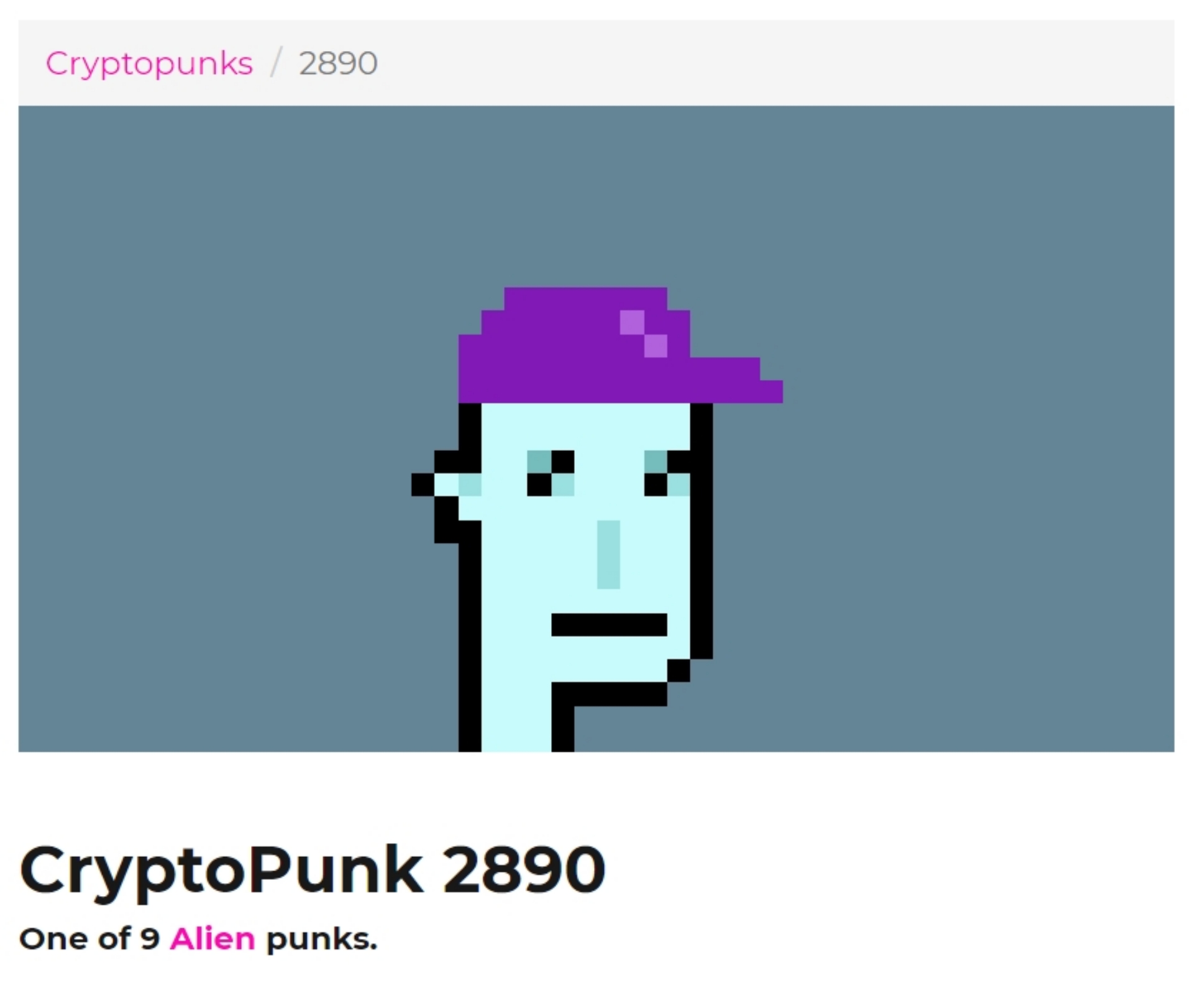 這件CryptoPunk #7523被稱為Covid Alien,是整個系列中的僅有九個「外星人朋克」(alien punks)之一,並如其名,是唯一一個帶著口罩的圖形,反映也忠實記錄了當今人類史無前例的一種生活樣貌。