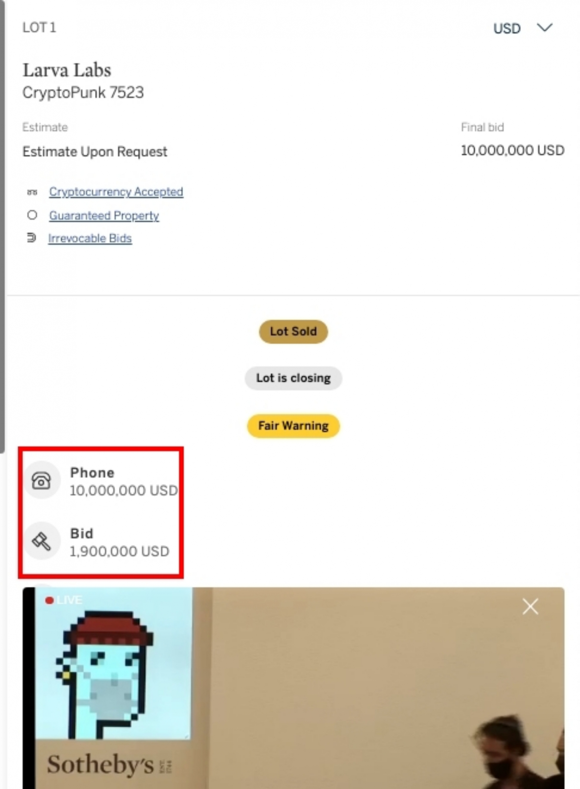 6月10日,另一個CryptoPunk NFT在紐約在蘇富比《原生數位》(Natively Digital: CryptoPunk 7523)專拍中,以超過 1,175 萬美元的價格售出。據蘇富比拍賣行稱,這次拍賣刷新了「單件CryptoPunk的世界拍賣紀錄( “a new world auction record for a single CryptoPunk”)。
