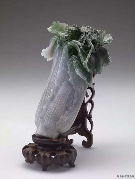 說到國立故宮博物院,不少人的印象就是那株曾經出現在教科書上的翠綠身影,是目前仍陳列在國立故宮博物院北部院區三樓「南北故宮 國寶薈萃」展廳中的〈翠玉白菜〉(圖1)。〈翠玉白菜〉以翠玉為質,匠人仔細觀察翠玉本身白綠相間的分布狀況,「量材就質」,雕琢出一顆鮮嫩綠葉、淨白葉梗的小白菜,且剛好襯著翠玉「輝玉(Jadeite)」玻璃光的特質;晶瑩剔透的光澤,更讓這顆用翠玉雕成的小白菜,宛若剛從田裡拔起的新鮮作物。工匠不只觀察了翠玉顏色分布,他們更將翠玉原有的瑕疵「藏」起來。〈翠玉白菜〉所使用的翠玉石塊本身有不少裂痕及斑塊,工匠通過雕刻葉梗莖脈,將裂痕模糊化,使人乍看之下看不到那些裂痕;他們也將顏色不一致的斑塊安排在葉子的部分,反而成為葉菜常見之水分不一、顏色不一的自然現象。