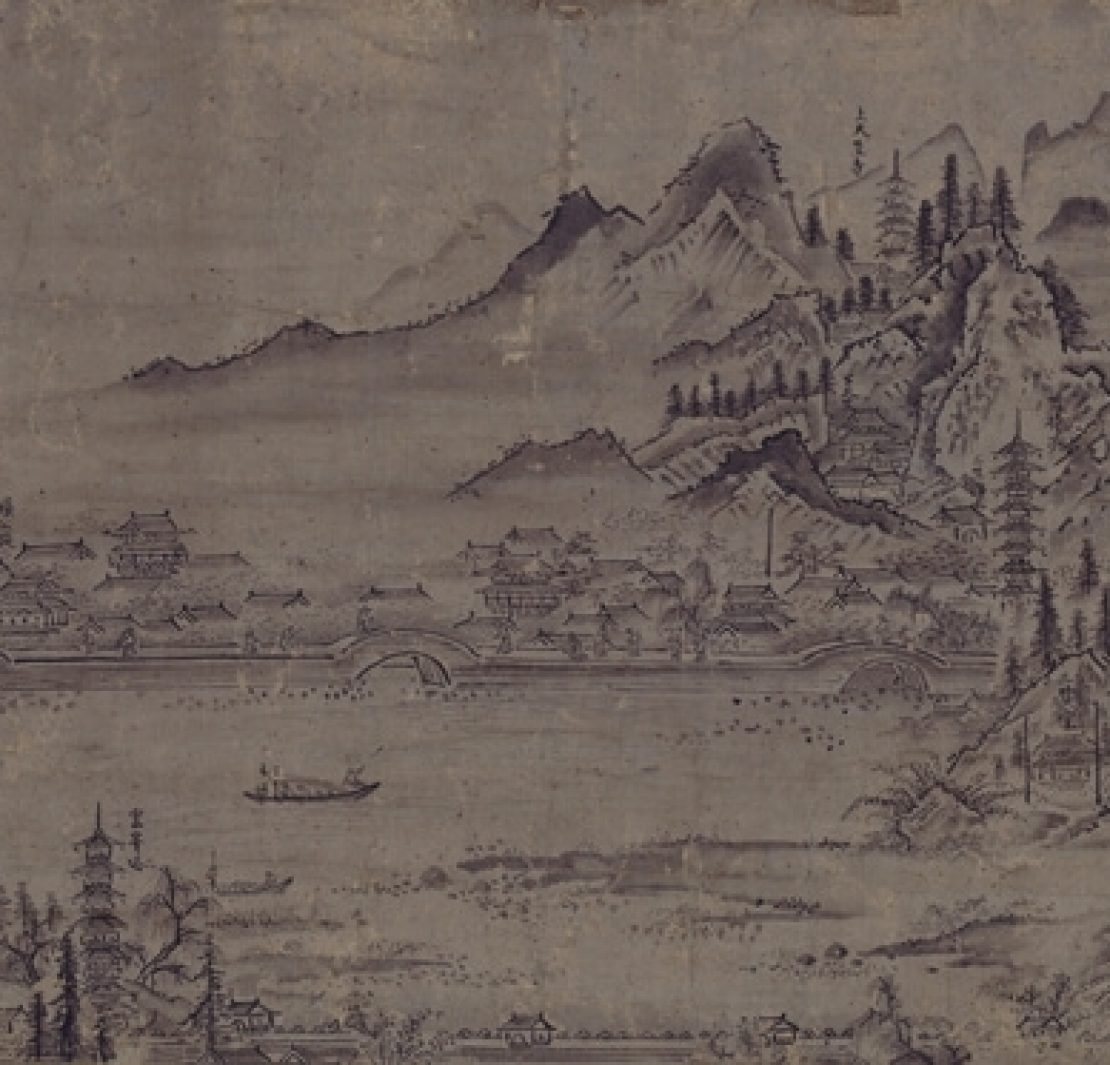 圖1 日本室町時代如寄〈西湖圖〉,紙本墨畫,42×90公分,日本天寧寺藏。圖∣日本天寧寺