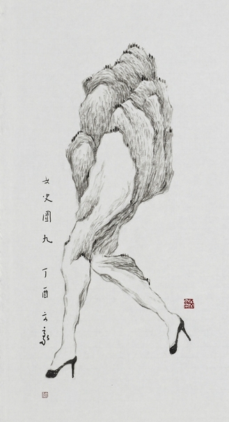 印象中,廖文豪的一筆一墨是斤斤計較又出神入化的。從2011年正式發表「山水人形」伊始,然後2013年「有意無意」個展,內容盡是「山水與人的結合」。就他回顧,這是第一階段人境一體的共生狀態。雖然筆墨、構圖、形式拘謹,圖像寓意凝重且學院派,但當時所繪是一個自給自足、不需向外探求,宛如待在羊水內的胎兒,對世界即便抱持些微好奇,但現實仍與自身無關。這一強調山石擬人化,或說「從人的軀體找山石」、「從山石找身體感」的創作觀,確實讓他一鳴驚人,作品獲得高詢問度。不過,畢竟年輕,無論創作或圈內環境,還是待人處事的生存問題,只能不斷摸索。精神物質相對惶恐不安,有所渴望,總看著他方,手腳不自在,心也不自由。再看看當時畫作內容,把想藉圖像說的話全放在了畫面中央。彷彿向世人大聲呼喊:「我在這!我在這!」而主角之外的其他,並非配角,只是裝飾。