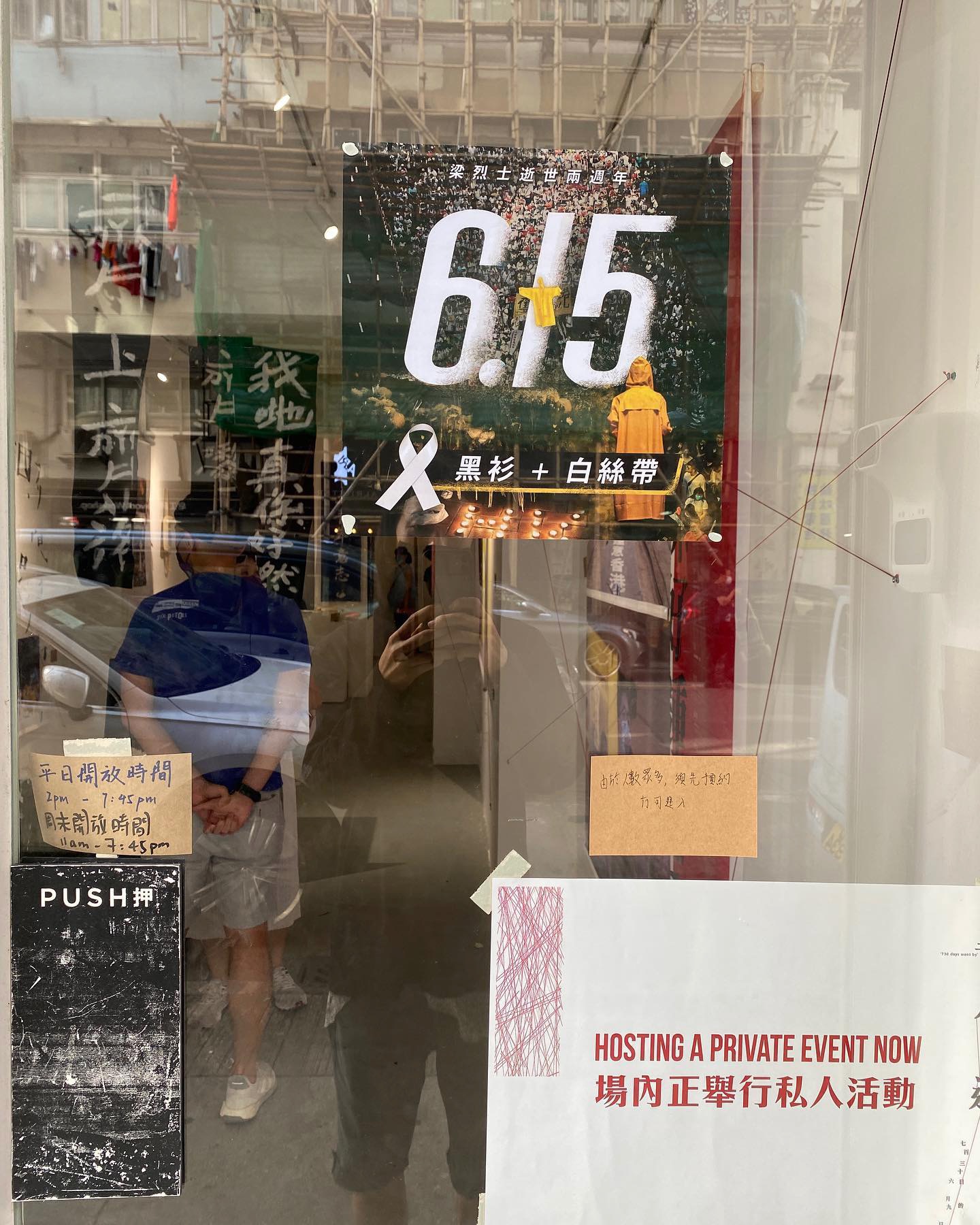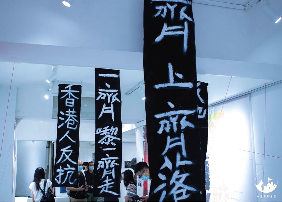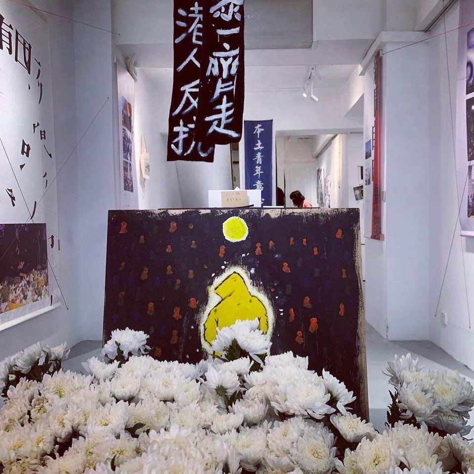 這個由「本土青年意志」舉辦的「『走‧過』—七百三十日的六月九日」(簡稱「走·過」)展覽,分為「初心」、「吶喊」和「花火」三個部份,在「Parallel Space」細小而明亮的獨立空間內展出,正是麻雀雖小、五臟俱全。展覽選擇在掀起整場反送中運動的6月9日開幕,並以「七百三十日」作為副題,既是對遺忘的拒絕,也是「去日苦多」的低迴。展覽在臨街的櫉窗內高懸「齊上齊落」(共同進退)、「一齊嚟一齊走」(一起來一起走)、「我地真係好撚鍾意香港」(我們真他媽的非常愛香港)黑底白字標語,以光明正大地的方式在後國安法時代實踐言論自由。除了按照時序和民間視角陳設的圖文紀錄外,展覽更在條幅底下安放了一幅以黃雨衣為記,並提供白色菊花予參觀者悼念反送中第一位犧牲者梁凌杰,巧妙地把展覽場所轉化成被禁絕於公共領域的儀式空間,盛載不合時宜的情感表達。