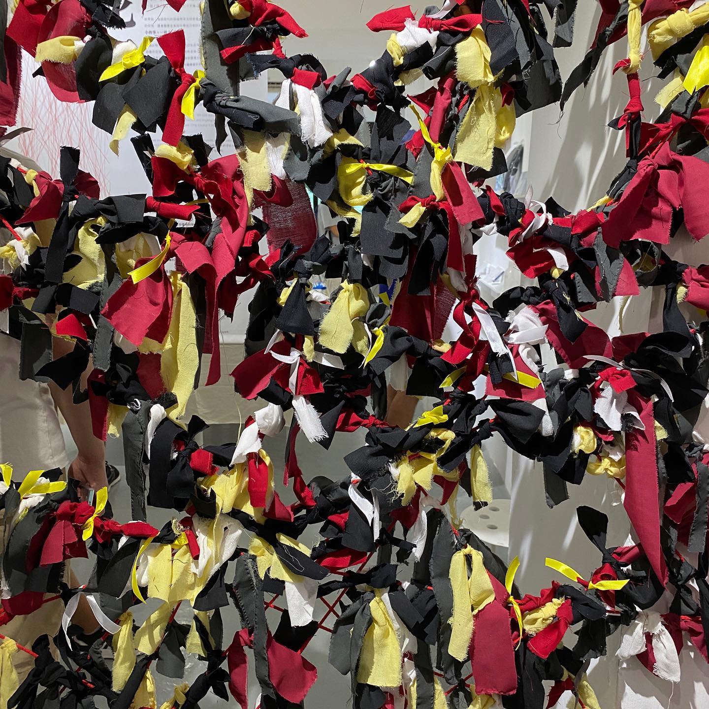 而這種以時間為緯度的展示,繼續伸延到較為私密的二樓。為了避免重複的影象對觀者做成視覺疲勞,展覽把波瀾壯闊的運動濃縮成十分鐘的音檔,存放在MP3播放器中,供觀者載上耳機聆聽。當觀眾坐下後,顧展的朋友便會把身後的捲簾徐徐落下,任其在這個如像告解亭的角落裡「哭之笑之」(註1)。觀眾聽畢,可以選擇最能代表此刻心情的顏色絲帶,繫在玄關上。這個題為「吶喊」的部份,一方面以鐵屋比喻今日香港,借左翼傳統反過來拷問共產政權的專橫;同時提供一個寧靜而安全的空間,讓沉寂之中的低迴得以被聽見。