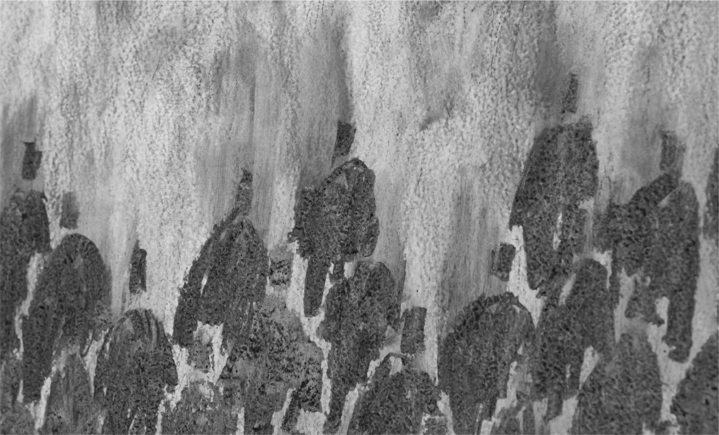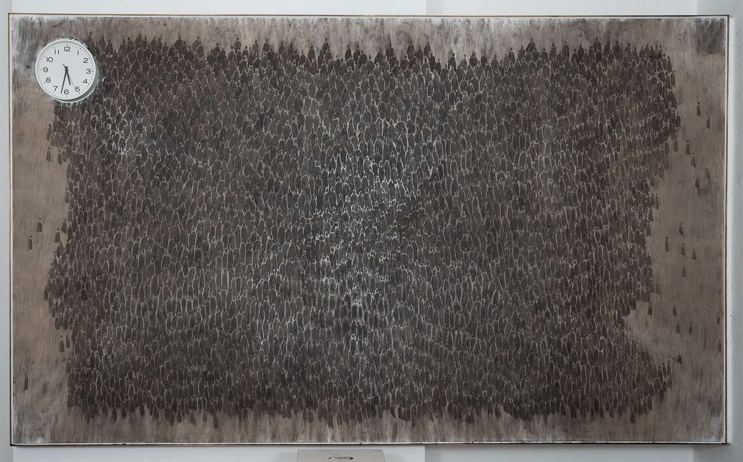 無獨有偶,「洞壁與哨鳴」不為紀念反送中而來,但亦以時間作為軸心。劉清華在一個如像洞穴的大館房間裡,在一面懸掛了時鐘的2乘3公尺的白牆上,每日以炭枝在上面繪畫,同時拍攝,持續半年之久。空白的畫面由一個站立在中央的人形開始,更多的小黑點陸續從四方八面進來,最後聚集成黑壓壓的一片,填滿整個畫面。然後她用重複的勞動力,把黑點逐粒擦去,背境的咚咚聲逐漸被流水的聲音掩蓋,最後小黑點融化成一壁的灰。整個非常簡單的配置,利用繪/動畫、炭枝/鏡頭的特性,同時呈現出時間和畫面的斷裂和延續性。