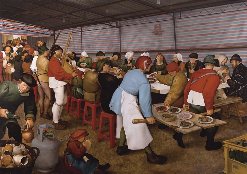 這一次在毓繡美術館的個展「是古非今」,是藝術家盧昉從西班牙返台的第三次個展,完整呈現他從2010年以來的創作。展場佈置也以歐洲古典美術館為樣本,將畫作掛在深紅色的牆上,微暗但精準的投射聚光,讓古典油畫技巧的細節,完整得被烘托出來,同時營造令人沉浸的氛圍,讓人誤以為北方文藝復興的布勒哲爾(Pieter Brueghel)的經典畫作《農民婚禮》(Peasant wedding)飄洋過海來到台灣,但仔細一看才發覺,原來這些農民坐在紅色塑膠椅上,經典的紅白藍帆布罩頂。