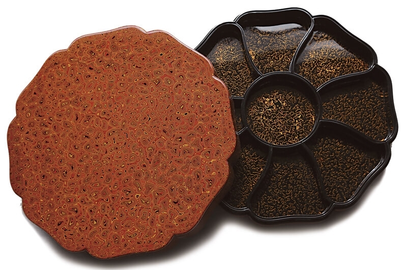 〈紅斑犀皮漆葵瓣式大攢盒〉。