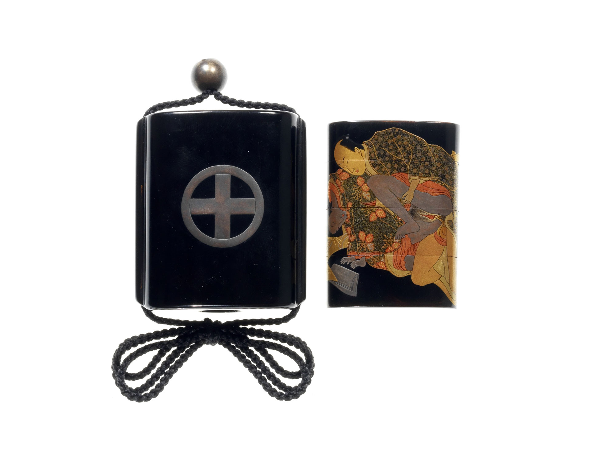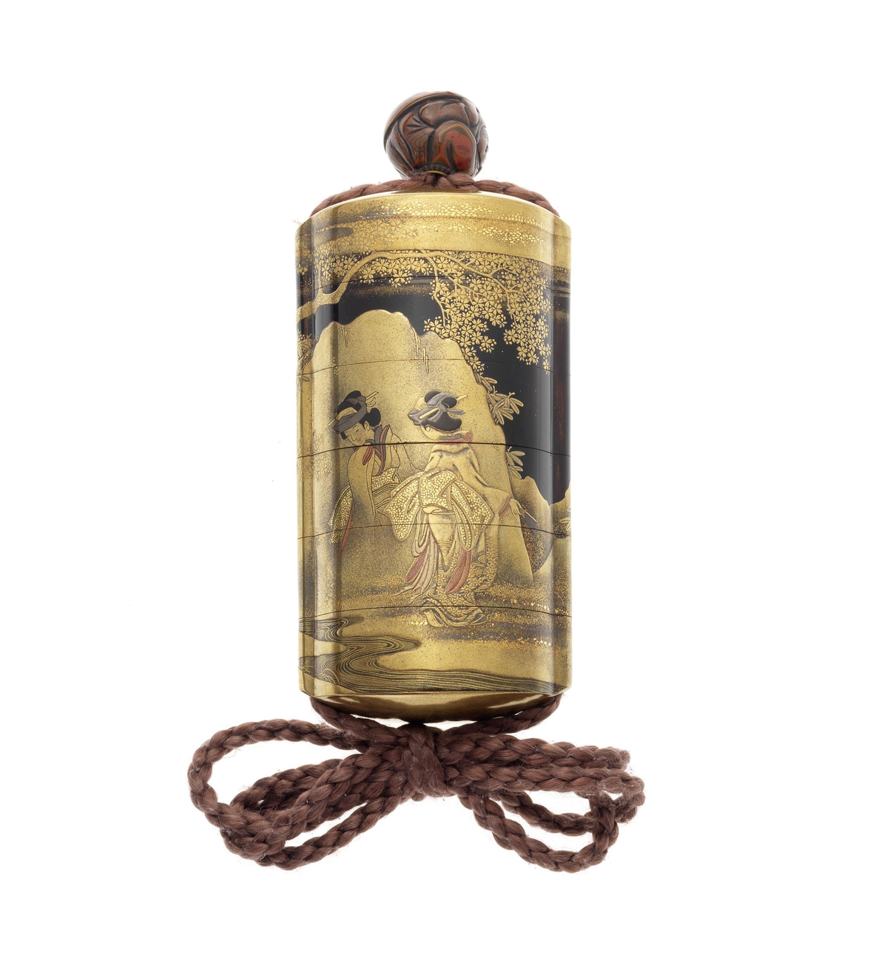 顧名思義,印籠就是「裝印章的盒子」,但後來也用於收納隨身小物,如藥品、菸草等。武士早在室町時代就開始配戴,配戴時會用紐(Himo,即繫繩)串起緒締(Ojime)、根付及印籠。當緒締往根付的方向推動,就可開啟印籠,構造為上下分層;當緒締往印籠的方向束緊,這個隨身小盒就會闔上,內容物便不會掉落。印籠兼具功能性及裝飾性,多以木竹或金屬製成,又以漆藝印籠最為精密。匠人在方寸之間創造無限可能,有時應名門大族的要求,畫上莊嚴典雅的家紋,抑或配合時間流轉,創造具季節感的動植物和景物圖案。一流的工藝吸引江戶時代的富家子弟及武士追捧,有些講究者會按時節及場合的不同,配戴各類型的款色,彰顯自身品味,為不可或缺的潮流時尚單品。