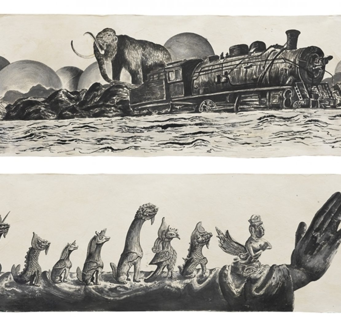 孫遜的《通向大地的又一道閃電》裝置,則包括手繪樹皮紙壁畫和一部雙屏手繪動畫投影。構圖強烈誇張的人物、樹木、鳥獸以及一些神秘符號和形象,打造出一個古今交融的奇幻世界,他在其中注入個人的生命經驗,對故鄉遼寧阜新的溫情回憶,以及中國經濟發展下南北社會巨大差異的反思。