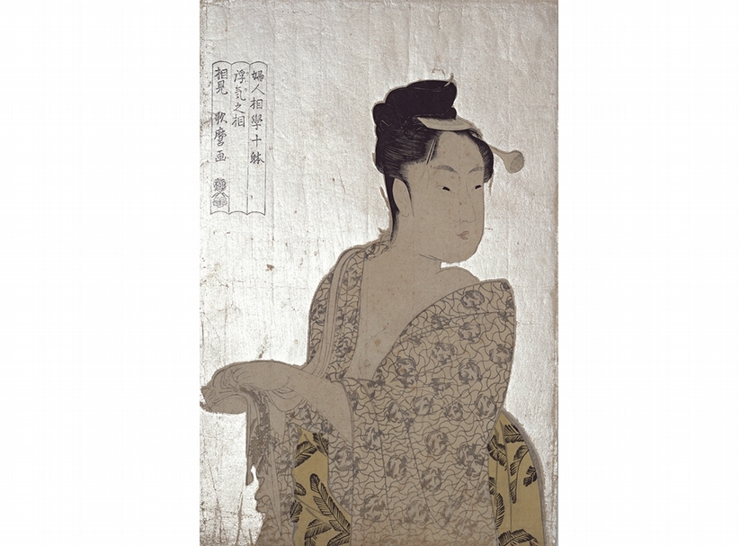 接續而起的浮世繪美人畫家,當推喜多川歌麿(1753?~1806),其美人風格與鈴木春信有相當大的差異,多使用「大首繪」構圖以表現美人上半身,且美人多具肉感、身姿豐腴、表情生動。是次展出〈婦人相十.水性之相〉(圖7),畫面以雲母粉鋪地,主角為一剛出浴的女子,浴衣半敞,濕透的秀髮以髮簪盤在頭頂、呈貝髷造型,以披掛在肩膀上的布巾擦拭著手,身體朝左前方略側轉,然女子卻向右前方回望,身姿略呈扭轉。