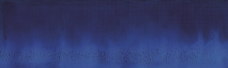 藍色,一直都是Jo Hsieh創作中的要角,同時藍色也是她探索個人內在靈魂與深處的重要媒介,在「時間」、「空間」系列的照相腐蝕版畫中,她透過藍色的單一性探究內在意義的縱深,此次展出的「粉末」系列則是Jo Hsieh極簡抽象藝術中最具代表性的系列。此系列的創作媒材(藍色粉末)主要來自Jo Hsieh於世界各地蒐集而來的藍色礦石,她利用這些礦石所研磨出來的藍色粉末作畫,以手一層層地推展於畫布上,直至粉末平整如一片藍色的絨布。這種高度身體性的創作過程同時也打開了她對於「非空間」概念的高峰,在「粉末」系列中,除了藍色粉末外,Jo Hsieh也在畫布上以刮刀、壓克力顏料堆疊、刮出不規則的肌理與線條,這樣的方式使得作品在遠看時呈現出具有某種呼吸韻律的能量感。此系列以極簡、抽象的語彙呈現出各種深淺的細緻藍色,一切攸關「純粹」與「生命」的想像,故畫面多以如黑洞、瞳孔般的圓,或如深海般的長條型構成,在極為簡單的湛藍畫面裡為觀眾帶出許多想像空間,同時,也因為材質的特殊性,使得作品不僅僅停留於視覺觀看,甚至也延伸到聽覺、觸感等其他感官的體驗空間。