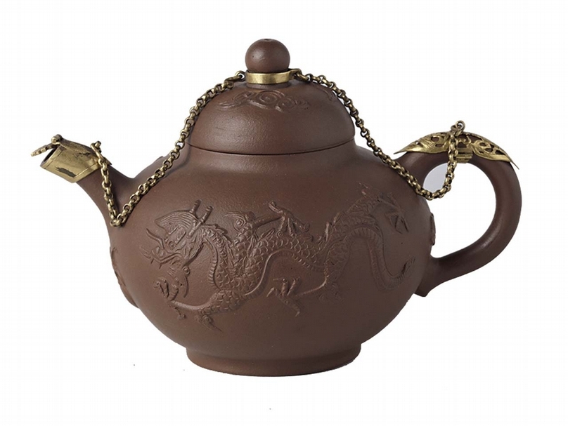 宜興外銷歐洲紫砂壺,立體紋飾是美感特徵,獨具新意地詮釋了同時期在其他外銷品類上,例如青花瓷在平面上彩的紋飾,表現出另一番活靈活現的中國風韻味。外銷歐洲後,這類壺形變成他們仿製的參考模本,為歐洲的新興茶具提供設計基礎。