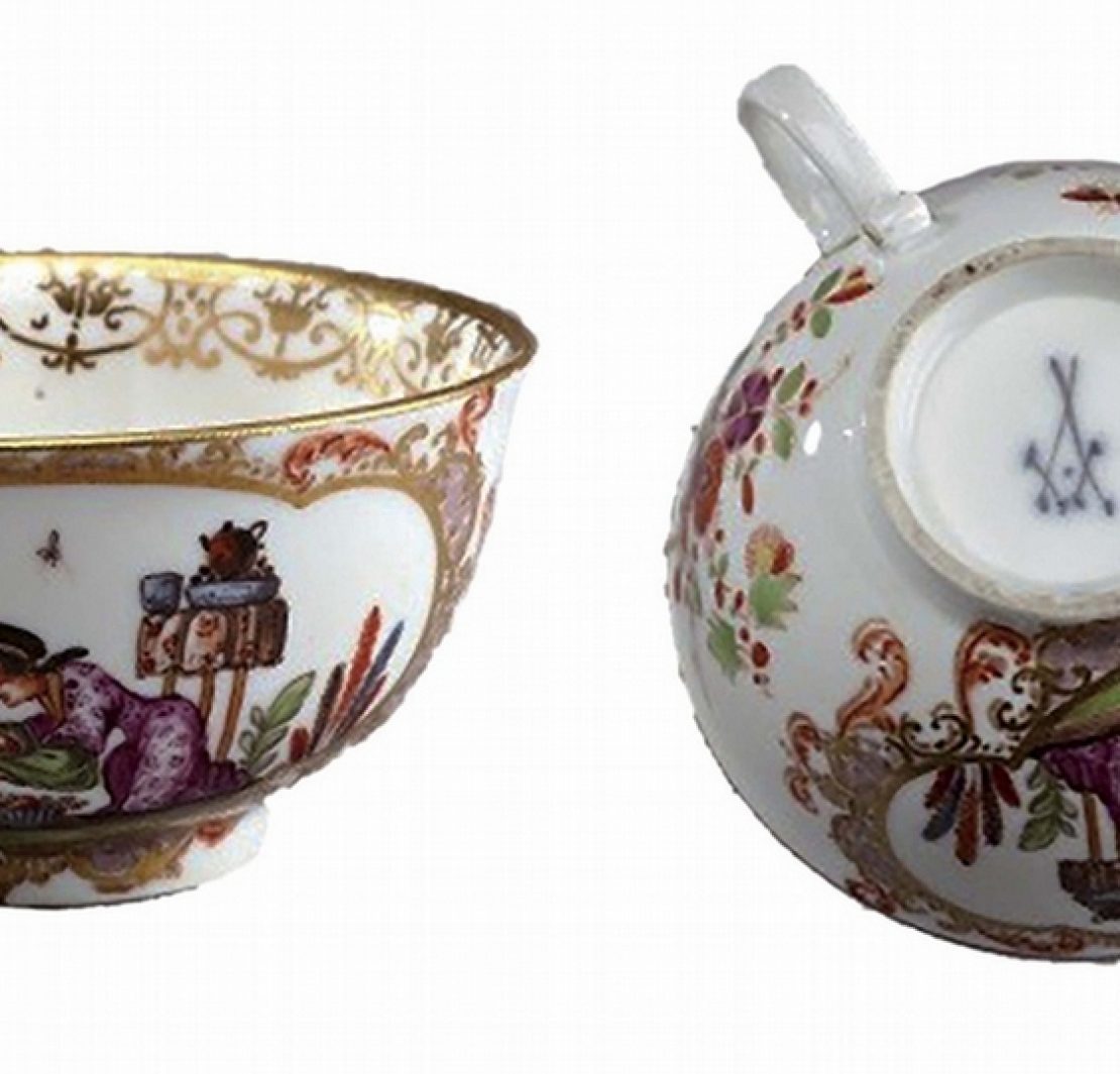 旁邊也展示了麥森瓷廠的白瓷金飾糖罐和茶鍾,開光處繪製德國「中國風」設計的中國人飲茶圖樣,是按1720年開始活動於麥森畫師Höroldt的中國風設計稿集繪製,這本設計稿集對18世紀歐洲窯廠瓷器裝飾產生很大的影響,茶鍾底部的雙劍交叉符號,源自1722年麥森督察官建議強者奧古斯都後開始採用,今天是世界有名的瓷器商標。