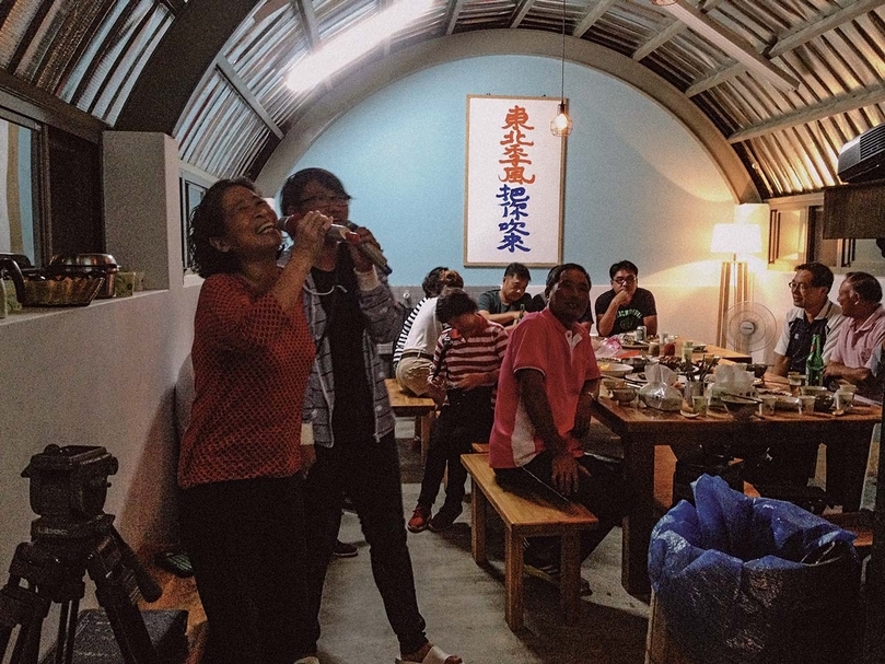 2016年,陳含瑜這個想法因為馬祖東莒駐村計畫而有實行的機會,在此,她思考的是一個駐村除了留下與地景互動的作品外,影像有無可能走入當地人的生活?當時她觀察到小島上雖沒有KTV店,但有很多家庭式卡拉OK機(連小學裡都有),她便在兩個月的駐村期間歸納出一套創作模式,首先是在地田調、與人相處,接下來選擇六個人做為紀錄對象(註3),然後在駐村結束之前密集地將紀錄影像剪接完成,搭配到各個被攝者自選的曲目中,最後舉行邀集被攝者與親友參與的卡拉OK大會。而在這個計畫中,她也會特別挑選對在地人而言具有記憶或特別意義的場所進行發表,在東莒駐村期間她選擇的是過去曾用於祭祀神明、聚會場所但現已成雜物倉庫的魚寮空間。在《魚寮點唱機:東莒卡拉OK記憶計畫》裡,她將魚寮空間重新整理、並在牆上張貼「東北季風把你吹來」等內容,再次邀請在地人回到這個場域唱歌。