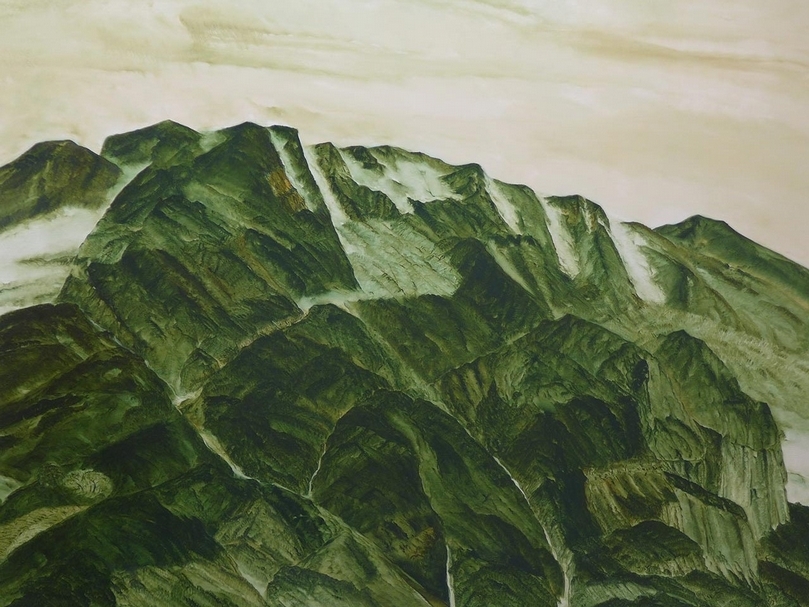 山水是林銓居重要的創作主題,《大海》、《雲霧蒸騰的海岸山脈》、《仰望樂舞山》、《桃樹與梯田》、《石齒山》與《龍泉部落後山》等作,無一不是駐村期間的寫生成果,有些畫作單張裝裱並獨立展陳,有些則是裝裱後,成組並置。與其說是寫生,其實更近似於身體感知後的痕跡證據,與其說是紀錄,不如說是成為自然風景一部分後的採集分享。作品中,環形筆記的孔洞往往保留在作品中心,難以忽略的留白,足見筆下的痕跡與過程,那是面對眼前風景時,視野的邊界與紙張的邊界,在筆與意,行與觀之間所交織的狀態,是面對「有限」時身體自然碰觸所產生的跌宕與積累。另外,在風格皴法之外,林銓居用筆富含更多的綿密與飽滿,如同農家逢年過節搓揉粿粄的手路一般,舒張而酣暢裡,有稠而不滯的量感在其中,而畫作中的用色,與其用赭石、花青、石綠來描述,在此筆者更想用草仔粿、老菜脯、醃豆醬、炒黑糖等食物的色彩,來親近林銓居筆下的景致。