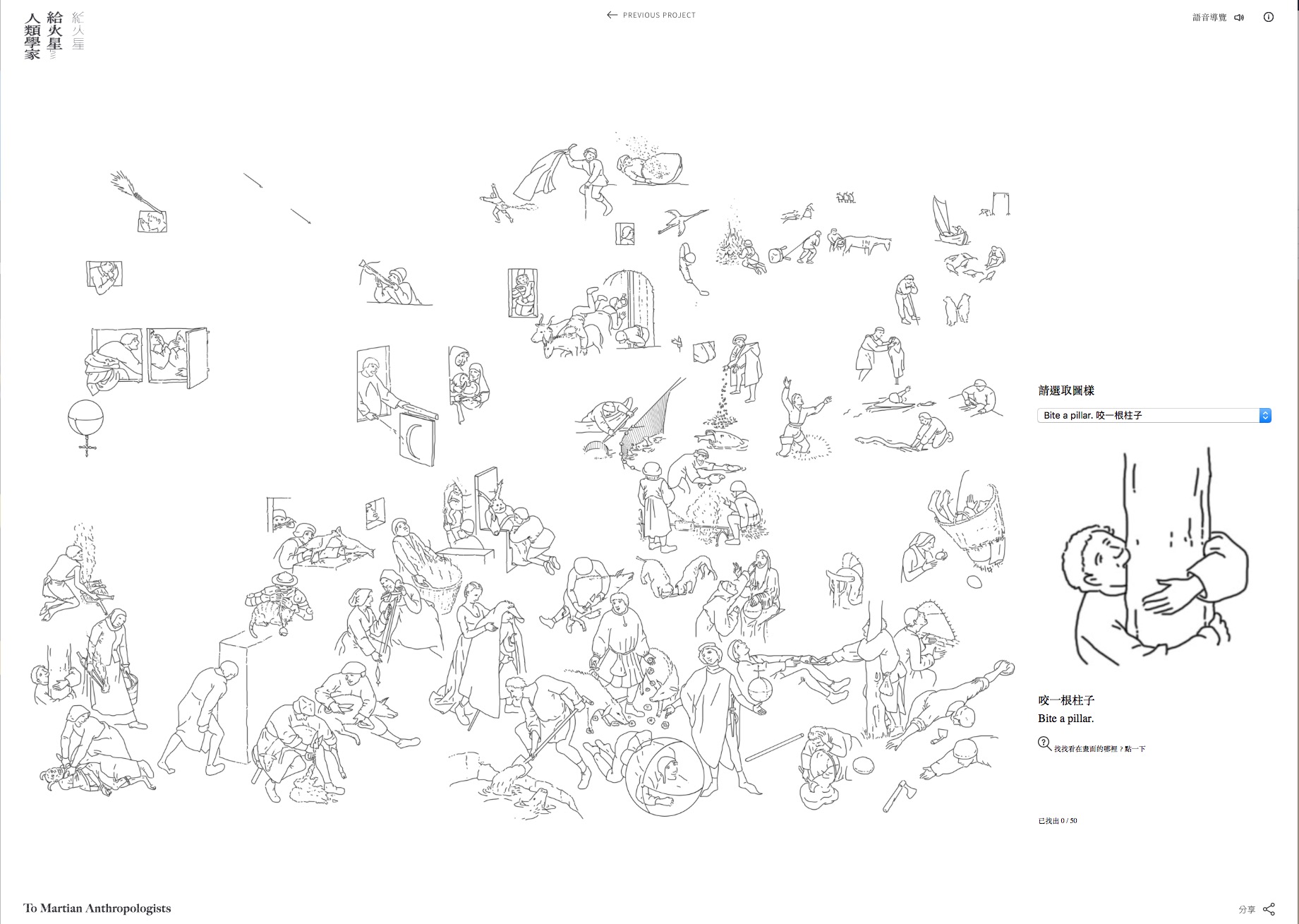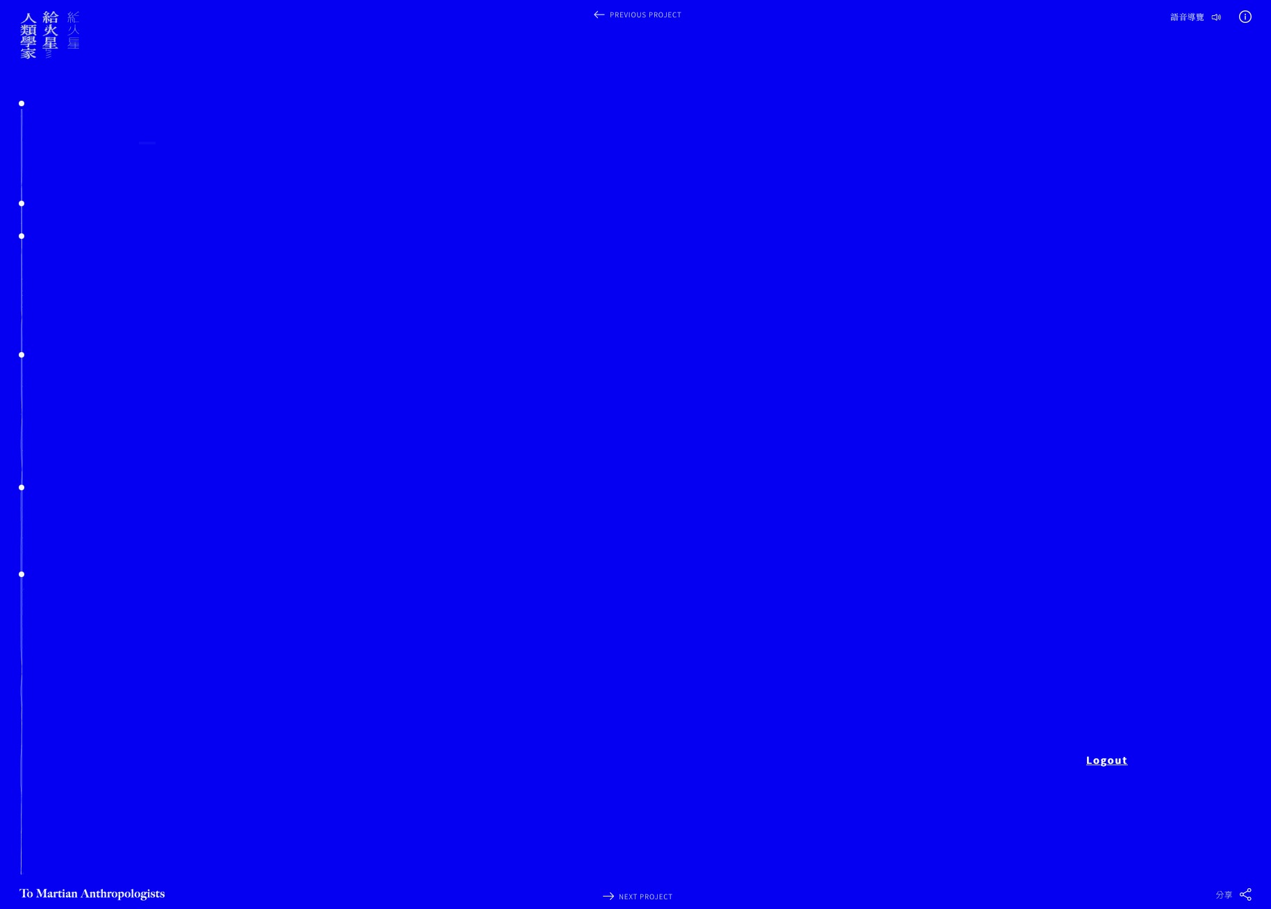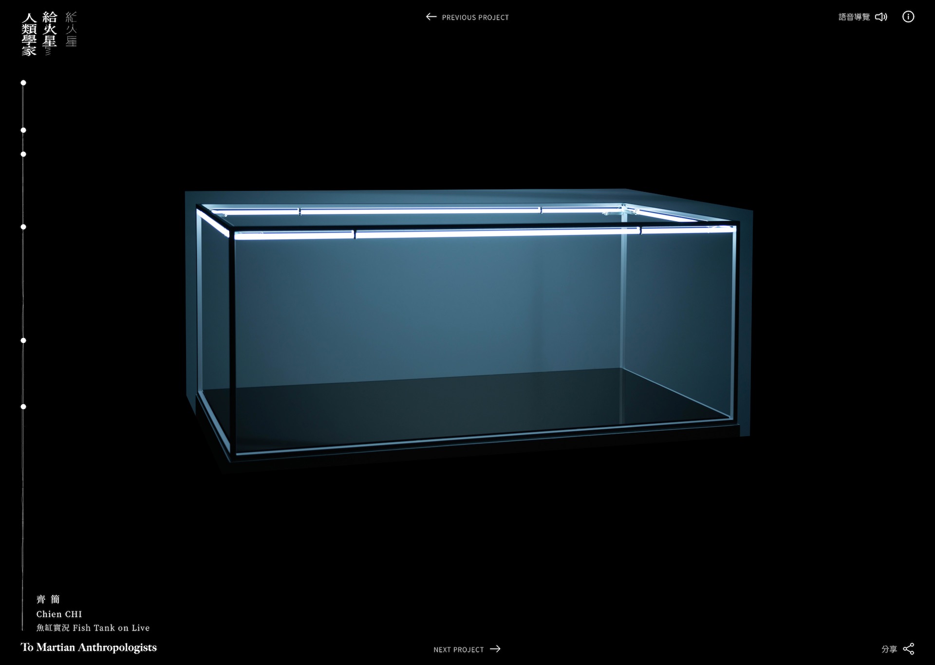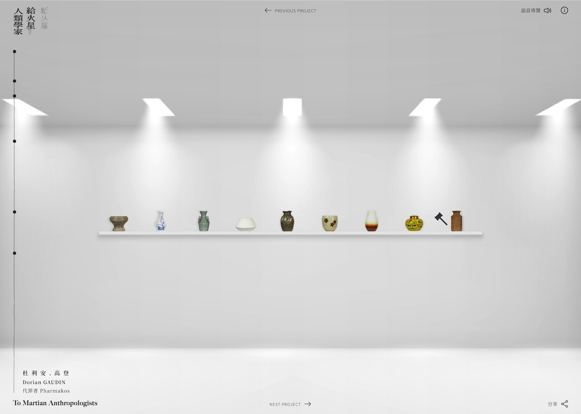 2020年8月,策展人張君懿策劃「給火星人類學家」,於新北市藝文中心開幕。年初展覽籌畫期間,遇到疫情大爆發,台灣進入警戒期,展覽在準時開展或取消的不確定之間變動,於是張君懿提出了一種多層次的實體與線上展覽策略。正如嚴瀟瀟所評述:「實體與虛擬兩種介面上的內容,不再是如今司空見慣的『再現』或是『紀錄』,而是一體雙生的關係,共構完整的作品場域。」實體與虛擬兩種介面成為互相參照、彼此強化意義的觸媒,策展人以網站空間作為日後「火星人類學家」考察人類文明線索的場所,實體展場反而成為虛擬展覽延伸的介面與部署。