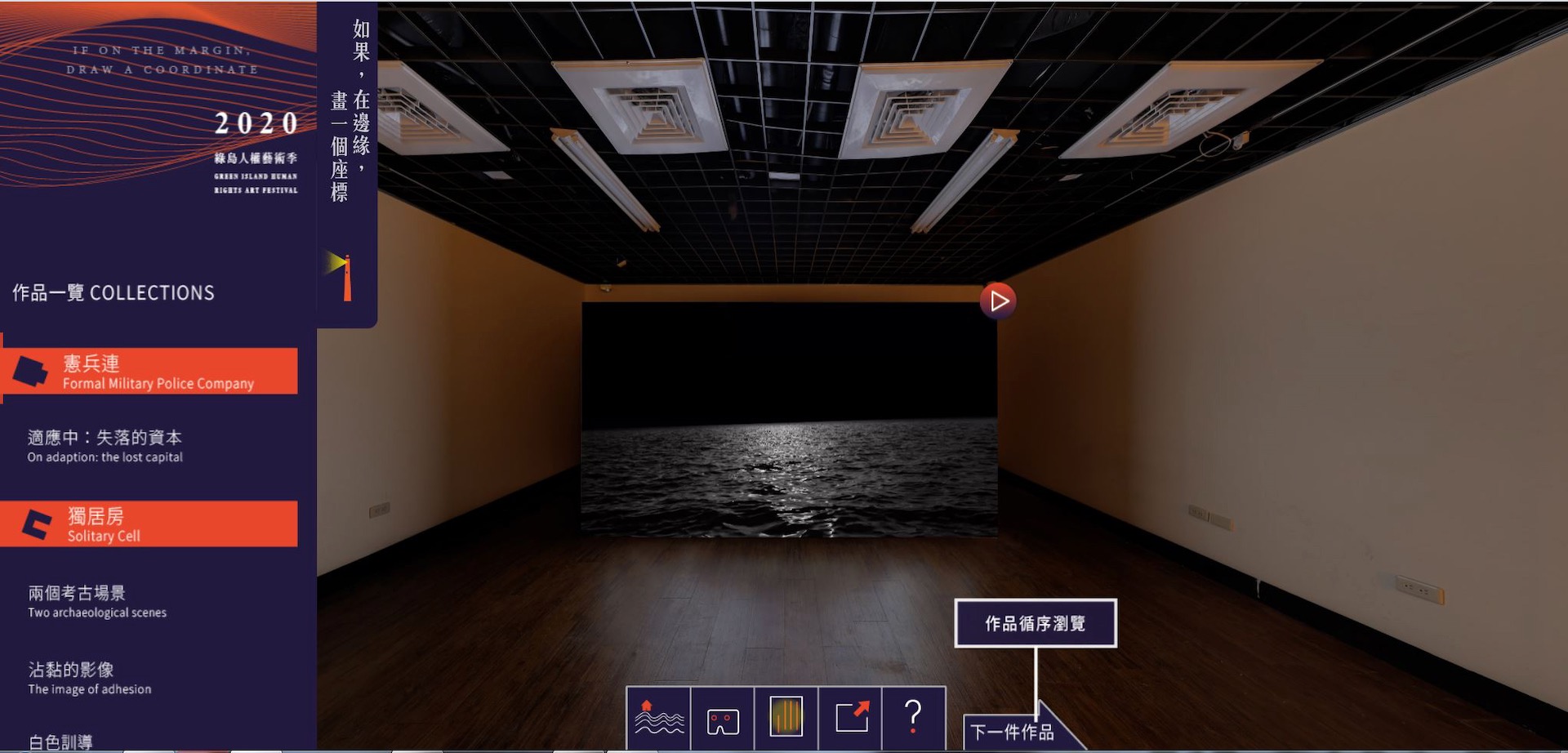國家人權博物館「2020綠島人權藝術季」720度VR環景展覽,進入網站時先以展覽主視覺標示展覽精神,白色恐怖綠島紀念園區的平面配置圖、策展人論述與宣傳短片。因此,觀者可先閱讀策展論述後,對於展覽內容有初步理解,再點選右下角的「Start」按鍵進入園區現場。畫面上提供操控說明,可選擇「Skip」鍵進入展館。畫面左側為各展館的選單,此展覽因為腹地廣大,每件作品都有自己獨立的展間,因此主要的控制除了以滑鼠進行的前進後退等,畫面上也隨時提供各種圖標選項。例如錄像作品除了在虛擬空間播放之外,觀者亦可以選擇播放鍵圖標,開啟全螢幕的錄像播放;牆上有作品與藝術家說明牌,亦可選擇圖標開啟文字說明與簡介影片。
