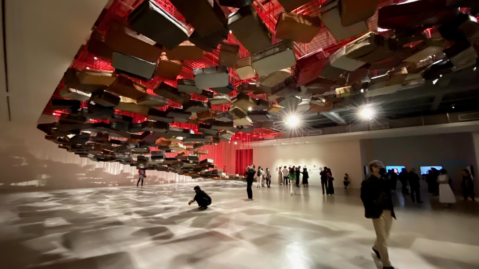 在開始討論線上展覽之前,先讓我們回到實體展覽參觀的情境中。疫情前(2021年5月初),作者造訪臺北市立美術館,觀看了一樓「塩田千春:顫動的靈魂」、二樓「大遷徙:盧明德」、與三樓「心神出遊─廖祈羽個展」。從展廳一樓進入「塩田千春:顫動的靈魂」以白線細密纏繞的船列,之後進入藝術家早期的行為表演作品紙本與錄像紀錄,了解其身體與紅線等之創作關係與脈絡;再進入由紅色線條纏繞黑色金屬框船身所創造的綿延而上之生命力,繼而進入黑色棉線纏繞的燒焦鋼琴與椅子、懸掛如鵲橋般的震動行李箱、廢棄窗戶堆疊的牆所構築的作品空間、偷窺被紅線牽引與纏繞的各種微型家具物件。身體行進於展間,在視覺震撼中感受,進入藝術家的死亡、生命、記憶、夢境當中,那是以視覺與身體所共同感知的觀展經驗。