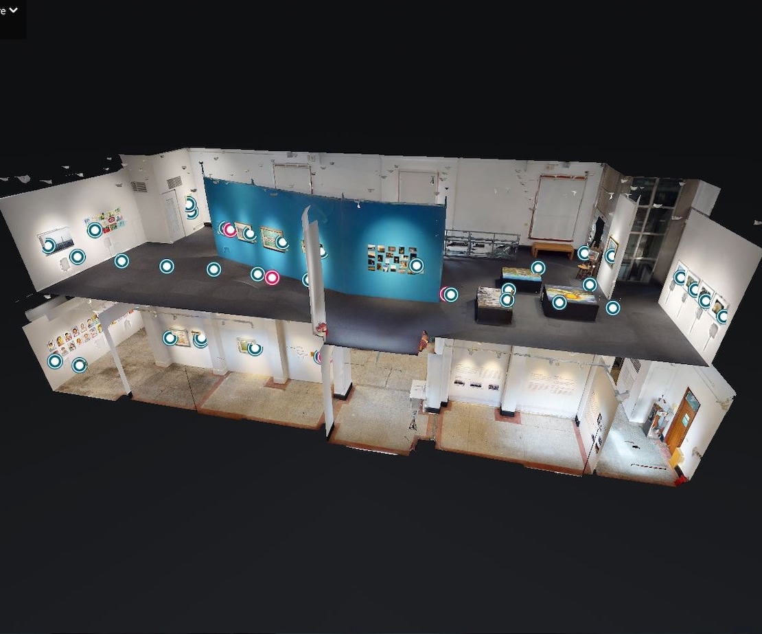 新竹市美術館「對話錄—新竹典藏教育現場」,由美術館網站提供單頁展覽內容頁面。進入線上虛擬展間,首頁是由3D掃描建置的場館模型,而後隨即進入場館入口處,觀者可以透過下方選單,選擇以娃娃屋(dollhouse)模式、平面圖樓層模式、或直接選擇樓層進入以滑鼠控制觀看。畫作旁有圓點圖標,可以選擇開啟作品說明視窗。控制過程常遇到的問題是,如欲調整水平視角觀看作品,跳離該畫作操控困難,在多方嘗試後終於成功。然而因為製作方式是現場實景3D掃描拍攝,如畫作裱有玻璃框,會有現場反射殘影。