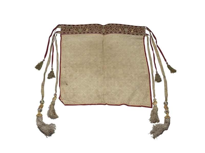 清18世紀〈蕾絲椿伯爾提面紗〉(圖4),這件作品以刺繡的方式做作成中間的蕾絲面紗,並在蕾絲上緣鑲繡著金絲線繡捲草紋紅絨帶,為中亞地區常見的刺繡技法,兩側的繫帶也精心講究,除繡有紋飾,更綴有寶石、珍珠等。此件作品外盒上寫有「椿伯爾提」,其含意雖不甚清楚,陳慧霞卻找到了一簽條,上面寫有「乾隆四十四年英吉爾沙阿奇伯克散秩大臣蘇勒坦霍卓恭進舂伯特一件」(展覽現場同時展出),推測此一簽條指的「舂伯特」即為展品〈蕾絲椿伯爾提面紗〉。經進一步查找資料,更發現這類面紗為塔吉克族女子出嫁時所用,屬於相對個人性的物品,陳慧霞設想這件曾經使用過的面紗,或許是出嫁女子自己一針一線、絲絲用心所製也說不定。