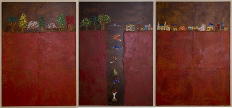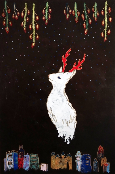 藝術家夏愛華1973年出生於台北,2000年畢業於國立台灣藝術學院,並於2003年自沖繩縣立藝術大學研究所取得碩士學位,2004年為沖繩縣立藝術大學院研究員,作品曾於美、日、韓、羅馬尼亞、香港等多處展出,展出經歷豐富。創作類型原以雕塑為主,後於某次駐村始發展平面畫作系列;創作上,她以自然界各種動物和精靈並結合自身潛意識想像為題材,每位動物、精靈都像使者般,為其捎來訊息,同時,她堅持使用古時製作佛像的活脫乾漆技法和日本的生漆;理念上,她相信古人所言,麻布在佛像中是代表人們的煩惱所交織而成的介面,且麻布能將這些困境吸納,故麻布在她的作品中是相當重要的元素,而作品內部的空心就像是人的潛意識世界,世界中有著真我,藝術家將創作過程中遇到許多困難的修煉精神和人面對自我潛意識做連結,認為都需要不斷地修煉,才能面對真我,以追求更好的境界;風格來說,她將日本畫顏料和透明生漆調和在一起,表現出有別於傳統漆藝的沉穩色澤,整體色調顯得多樣繽紛,呈現魔幻空靈的氛圍。此次新作《日落之後.月升之前》系列作品,為創作者於某次旅程中憶起過往去德國的搭車路途中所看到的風景,便誕生了此系列,從三聯作畫面上,可見佈滿晚霞餘光的原野,遠處上方矗立一排的樹叢及房舍,許多動物精靈一一進入樹叢和房舍中間的那一道秘密通道,看起來既奇幻又神秘,上了漆紅外露的麻布,為此系列的特色。《燦爛陽光的午後》為藝術家夏愛華去年於新宿外苑的森林裡,與一紅衣小男孩的奇遇,她將這個男孩做成穿著紅色麻布衣的精靈,並連同男孩周圍環境底下的鮮豔蘑菇一同呈現出來,傳達她藉由自己的潛意識空間,以解救她當時那段時間所遭遇到的困境。「當人們遇到困難或是精神上無法度過的難關,只要能找到療癒自己的潛意識空間,就能自己幫助自己度過每一次的難關。這是我在每次創作上希望能帶給觀者的啟發」夏愛華如是說道。