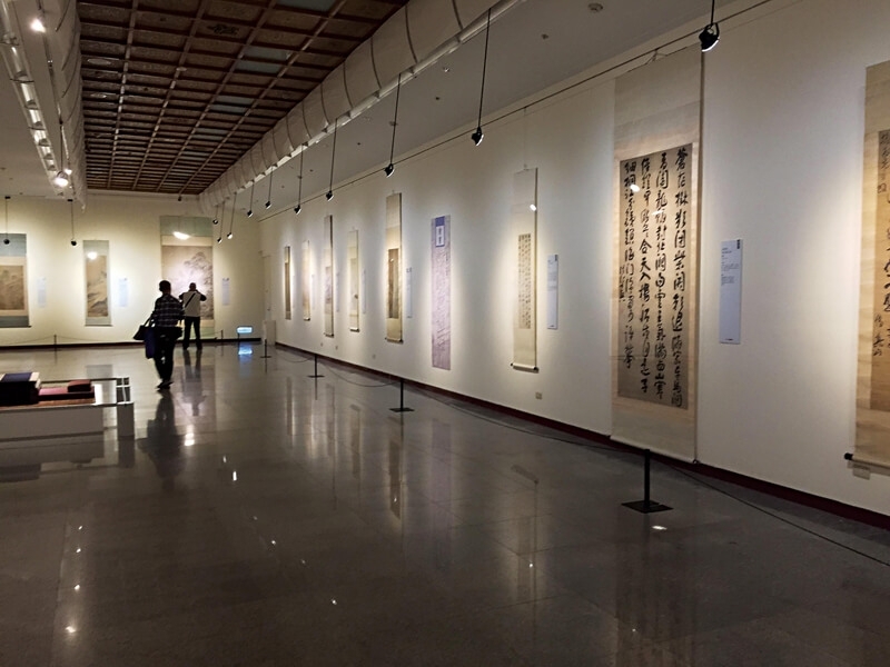 中正藝廊的展廳樓層高度夠高,能讓傳統中國書畫的巨幅作品連同裝裱完整的展開,這種觀看經驗是難得的。通常當展品受到展廳樓層高度的限制時,裝裱上下被捲起來,只展畫面的部分,這是不得不的選擇,也好像理所當然。然而,當巨幅畫作完整展開時,裝裱所蘊含的形式、尺寸、顏色、紋樣、高度等資訊就會被觀看到,也才有可能延伸出許多文化內容的想像:比方為什麼要畫的那麼大?如此的巨幅裝裱要掛在哪裡?相對的掛畫的牆面與空間要有多大?當裝裱被隱藏起來,屬於某個時代的美感經驗也被隱藏起來。這是裝裱作為歷史資料,需要被保存的重要理由。